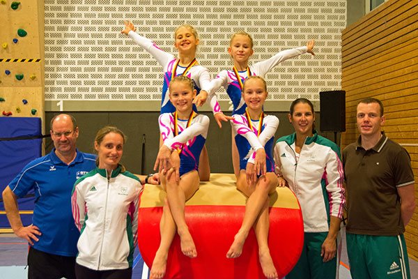 Das Team setzte sich aus sechs Turnerinnen der Altersklasse 12 und 13 zusammen, Leonie gehörte mit ihren zwölf Jahren zu den jüngeren Turnerinnen. Sie startete am Stufenbarren mit einer sehr gelungenen Übung in den Wettkampf. Am Balken musste sie leider bei ihrer schwierigen Verbindung aus Menni, Menni Spreizsalto das Gerät einmal verlassen, zeigte aber ansonsten eine sichere Übung. Am Boden konnte sie mit Doppelsalto, Doppelschraube und erstmals einer Verbindung aus eineinhalb Schrauben rückwärts in den Salto vorwärts punkten. Am letzten Gerät, dem Sprung lief es dann nicht ganz nach Plan und sie turnte nach dem Ansatz des Yurchenkos hinten keinen Salto mehr. Letztlich belegte die Mannschaft aus Deutschland hinter der Schweiz und Frankreich den dritten Platz und Leonie kann mit einer Menge neuer Erfahrungen und Eindrücke nach Hause fahren.